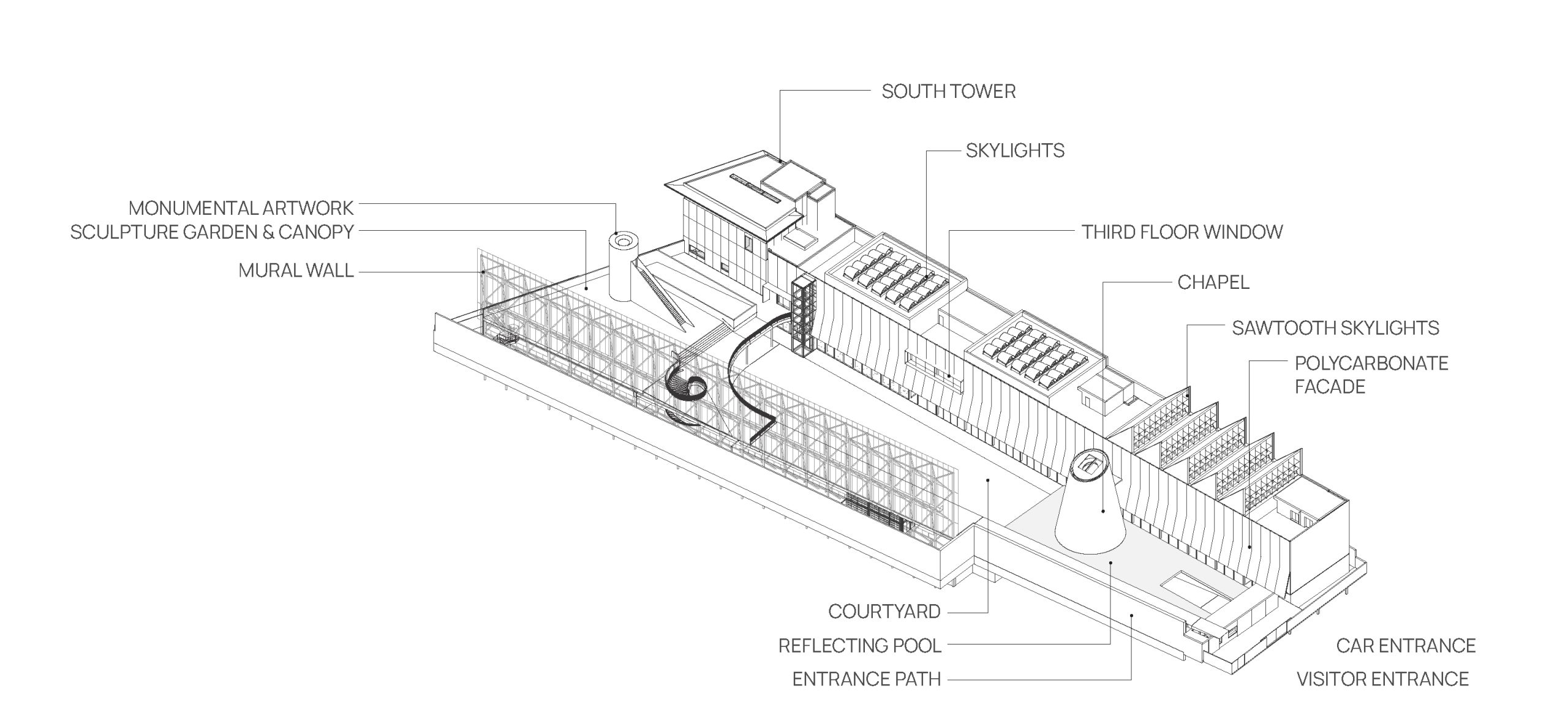 The project uses the building’s long, narrow proportions to reinforce linearity through its canopy, cantilevered roof, and railing details, while the north-end “chapel”—a tall, conical gallery—serves as a spiritual focal point for the center, encouraging reflective engagement with art. Embracing the industrial character of the existing structure, we left ducts, pipes, and devices exposed, adding an honest, approachable aesthetic. This transparency highlights the building’s original character and contributes to a raw, authentic atmosphere. Within the gallery spaces, varied shapes and sizes allow curators to experiment with multiple layouts, offering flexibility for everything from intimate installations to large-scale traveling exhibits.